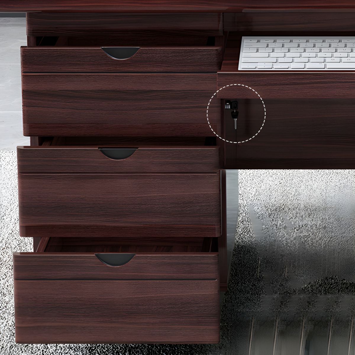 Triple Drawer Organization: Three spacious left-hand drawers provide ample storage for files, stationery, and personal items, keeping your desktop clutter-free.