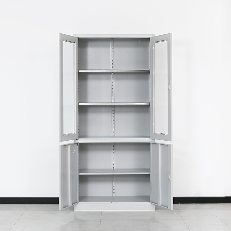 Dual-Zone Storage: Combines a three-tier glass display section with a spacious lower steel cabinet to separate public and private office essentials.