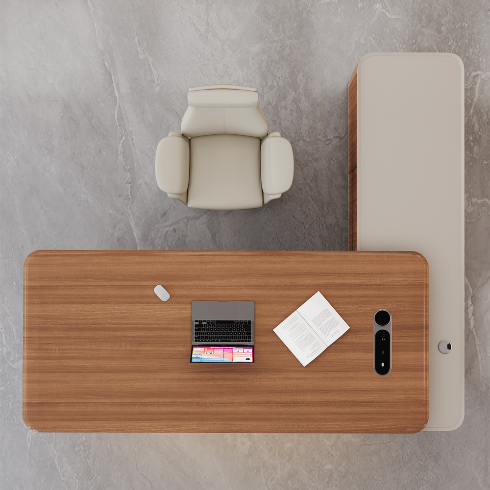 Ergonomic L-Shaped Workspace: The expansive main desk is paired with a matching side return cabinet, providing a vast surface for multitasking, computer setups, and private meetings.