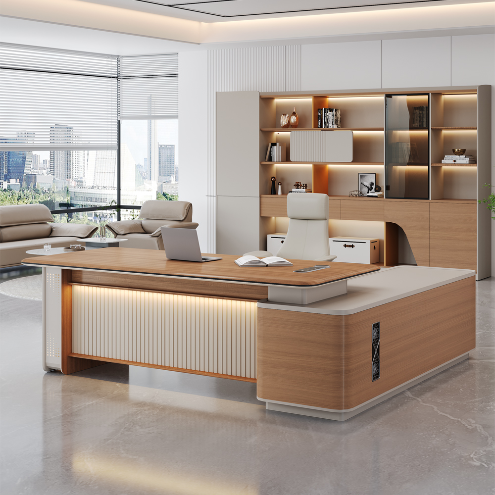Signature LED Ambient Lighting: Features a stunning integrated light strip across the fluted front panel, creating a warm, prestigious atmosphere that highlights the desk’s architectural beauty.