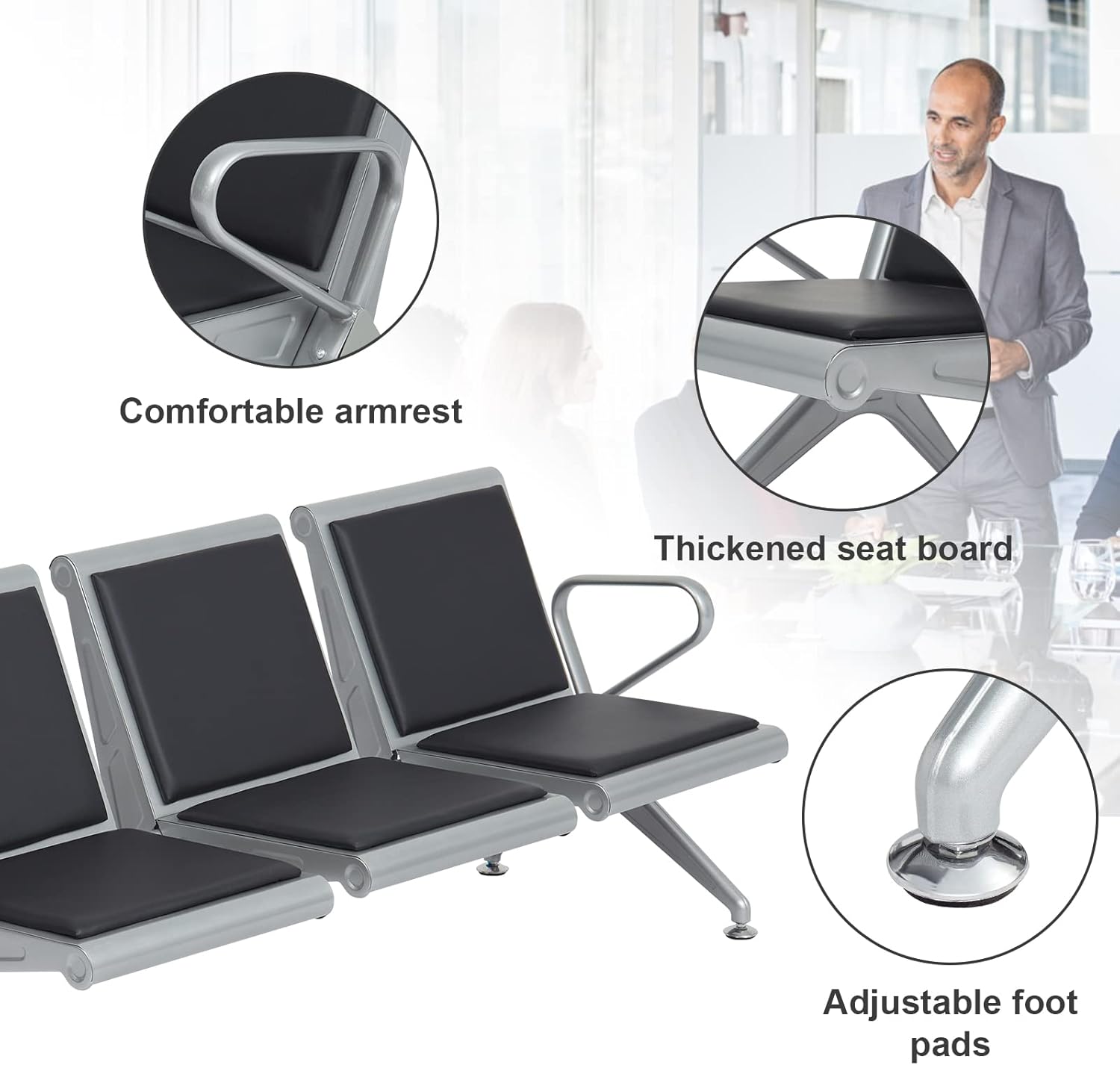 Create a professional and comfortable waiting area with our 3-Link Heavy Duty Office Waiting Bench, designed for high-traffic environments. Built with a strong steel frame and durable seating, this bench offers reliable support while maintaining a clean, modern look.Ideal for offices, hospitals, clinics, banks, schools, and reception areas, it comfortably seats three people and is engineered to withstand daily heavy use.