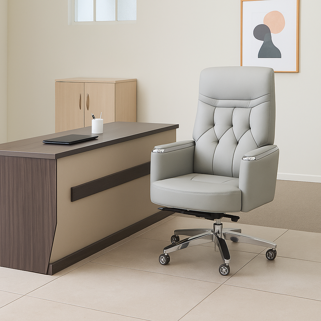 Redefine your workday comfort with the perfect fusion of executive style and ergonomic design. This high-back executive recliner chair is crafted for professionals who demand both performance and elegance. With a sleek grey finish, polished chrome accents, and plush cushioning, it brings a commanding presence to any office or workspace.