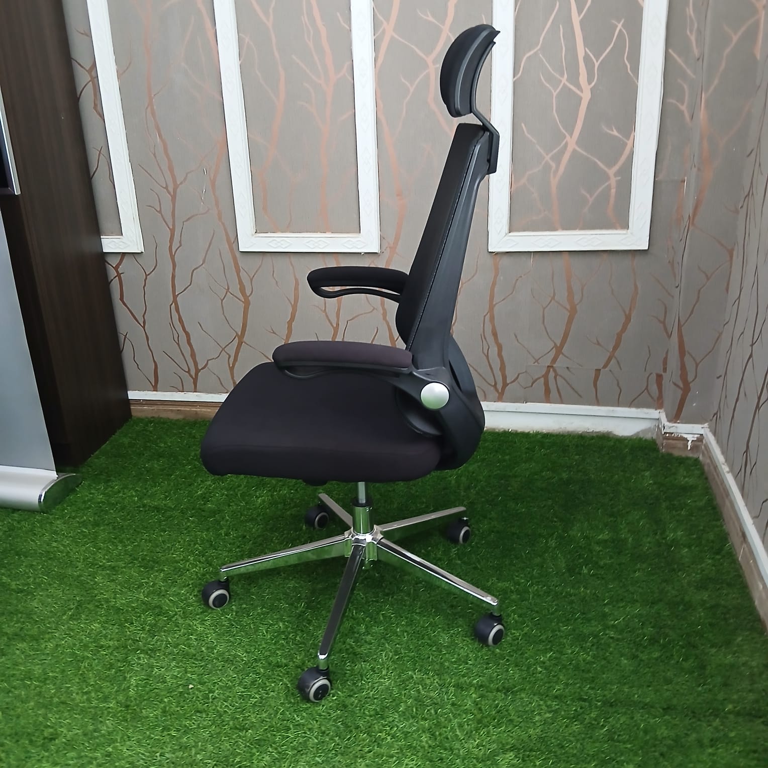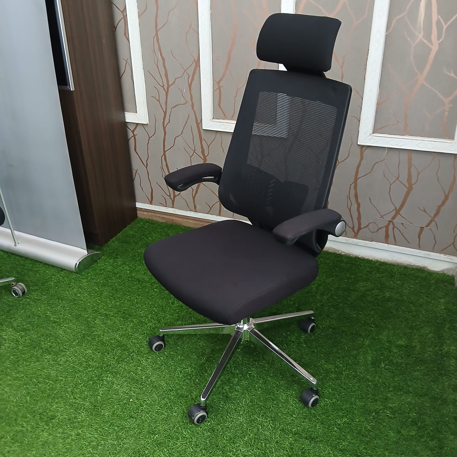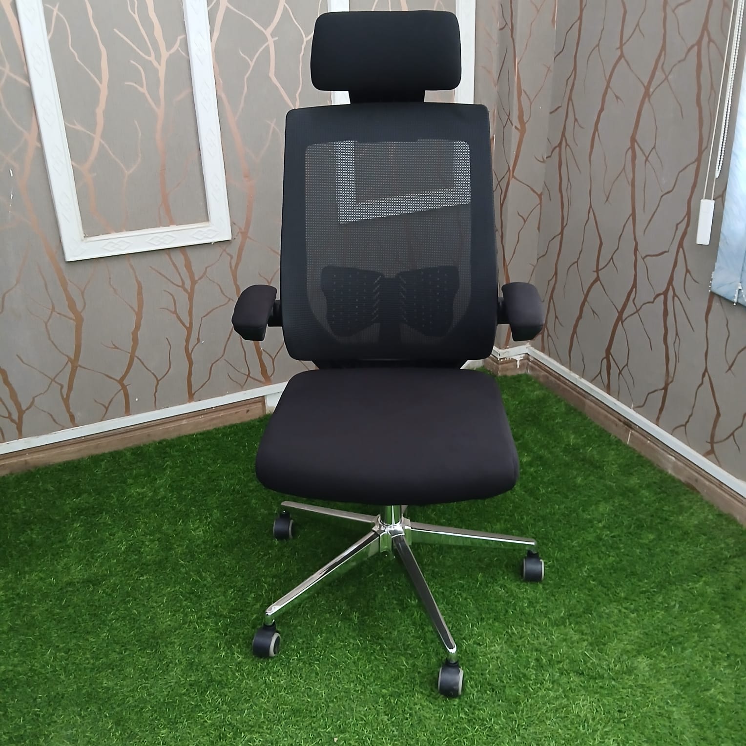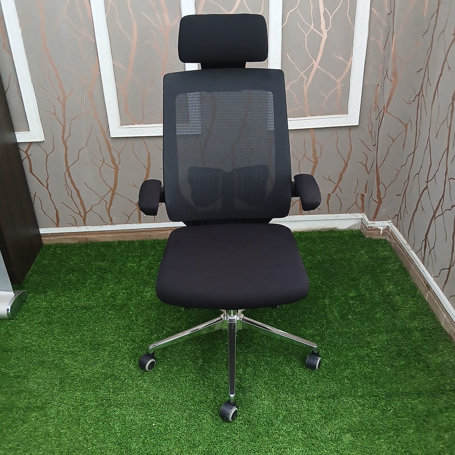 Upgrade your workspace with this premium ergonomic office chair designed for all-day comfort and productivity. Featuring a breathable mesh high-back, this chair provides excellent airflow while offering strong lumbar support to reduce back strain during long working hours. The adjustable headrest and padded armrests ensure personalized comfort, while the generously cushioned seat delivers lasting support. Built with a sturdy chrome base and smooth-rolling castor wheels, the chair offers stability, durability, and effortless mobility across your office space. Perfect for executives, home offices, and modern workstations, this chair blends sleek design with ergonomic performance.