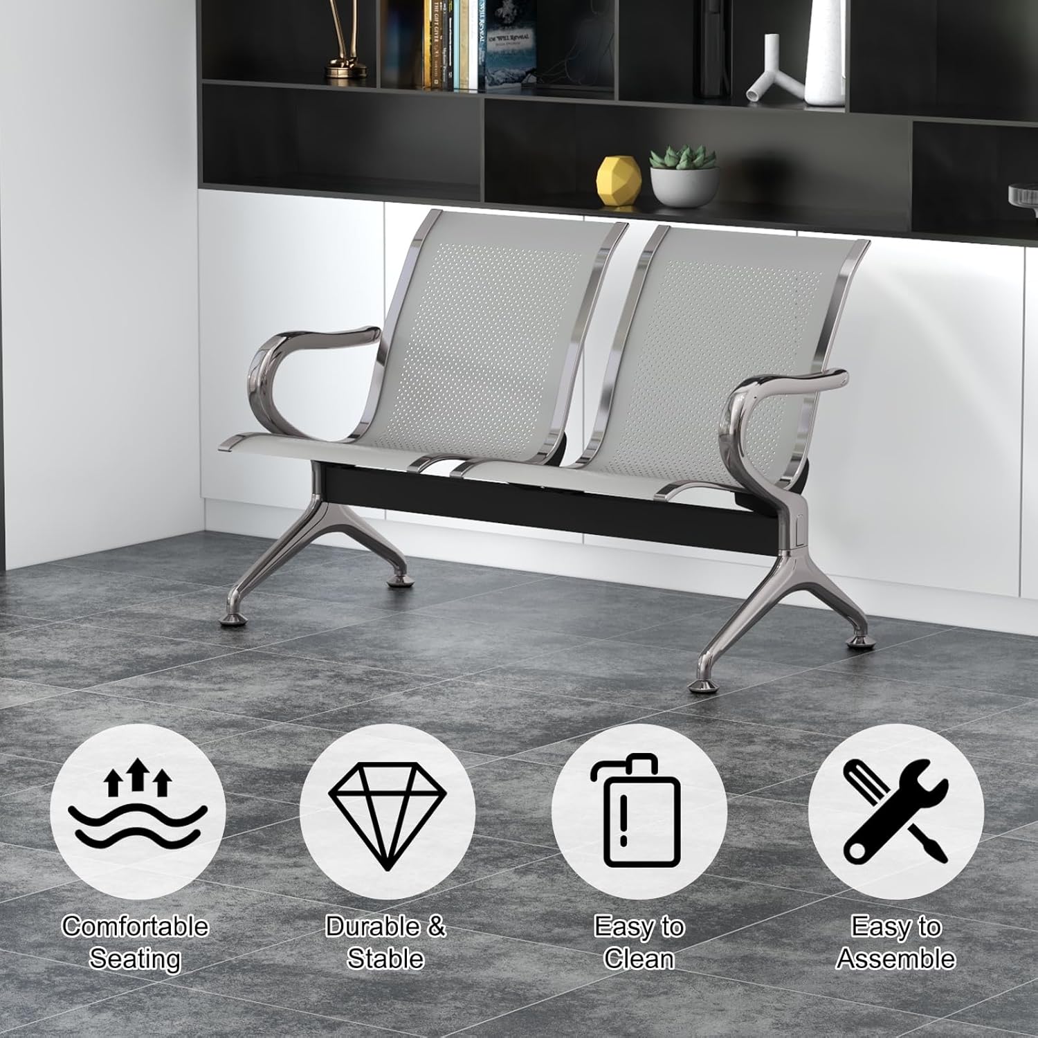 Premium Padded Seating: Each of the three seats is outfitted with thick, high-resilience foam cushions upholstered in durable, easy-to-clean leatherette for a softer waiting experience.