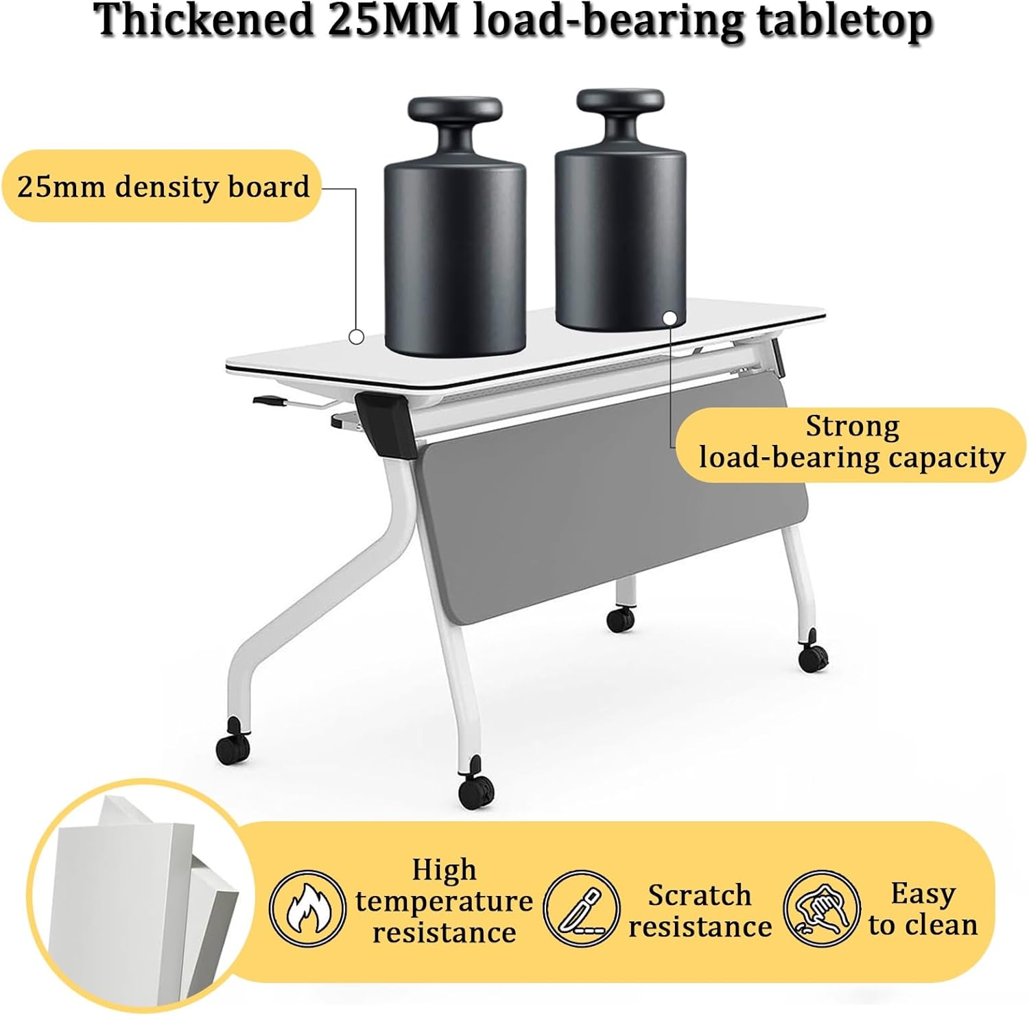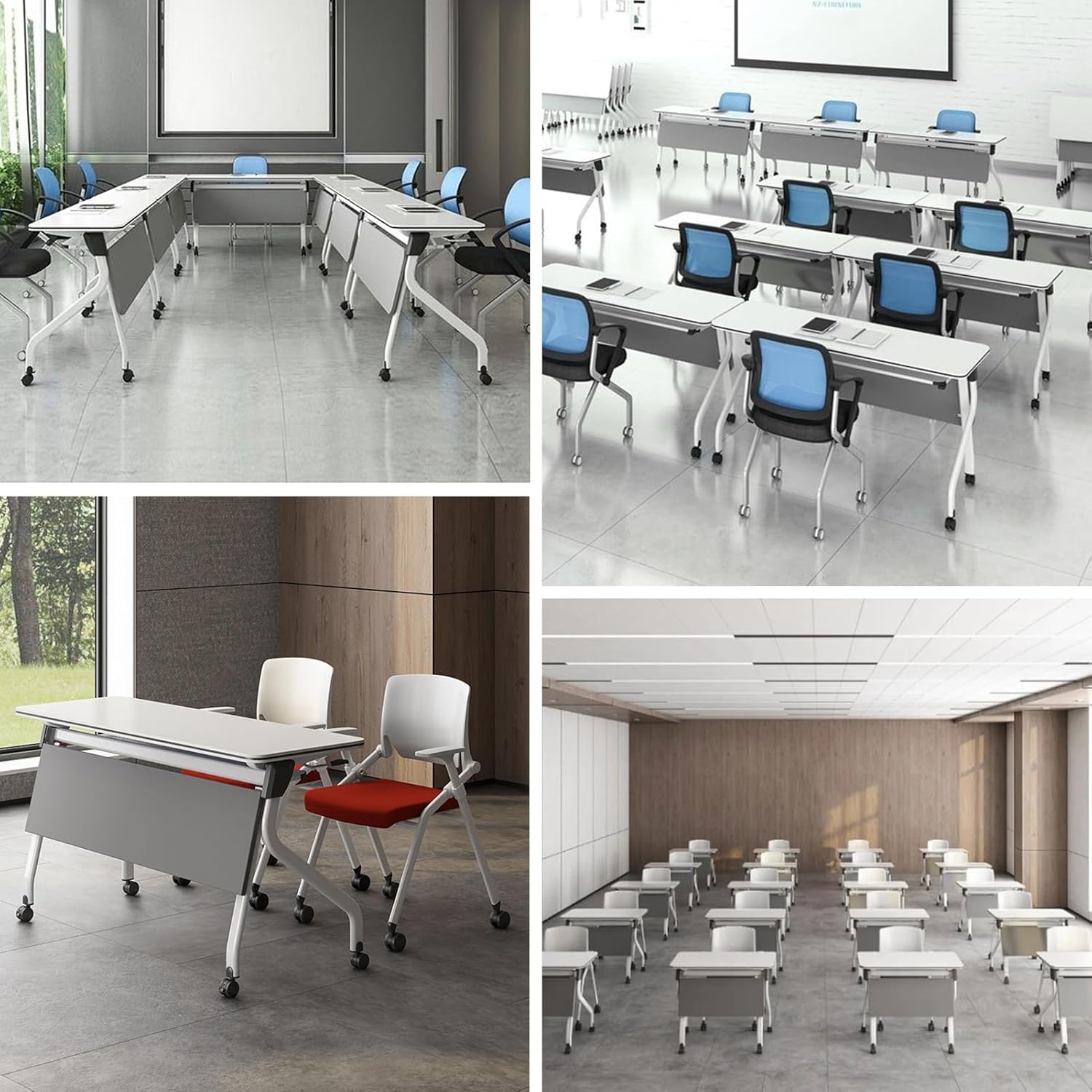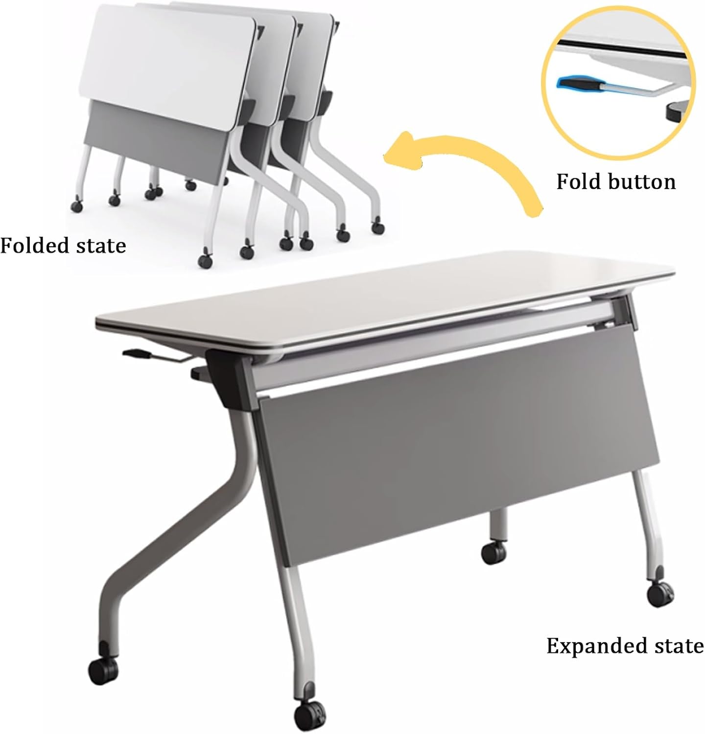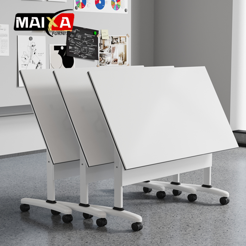 One-Touch Flip Mechanism: Seamlessly transition from a flat workspace to a vertical storage position, allowing multiple tables to nest together and save valuable floor space.