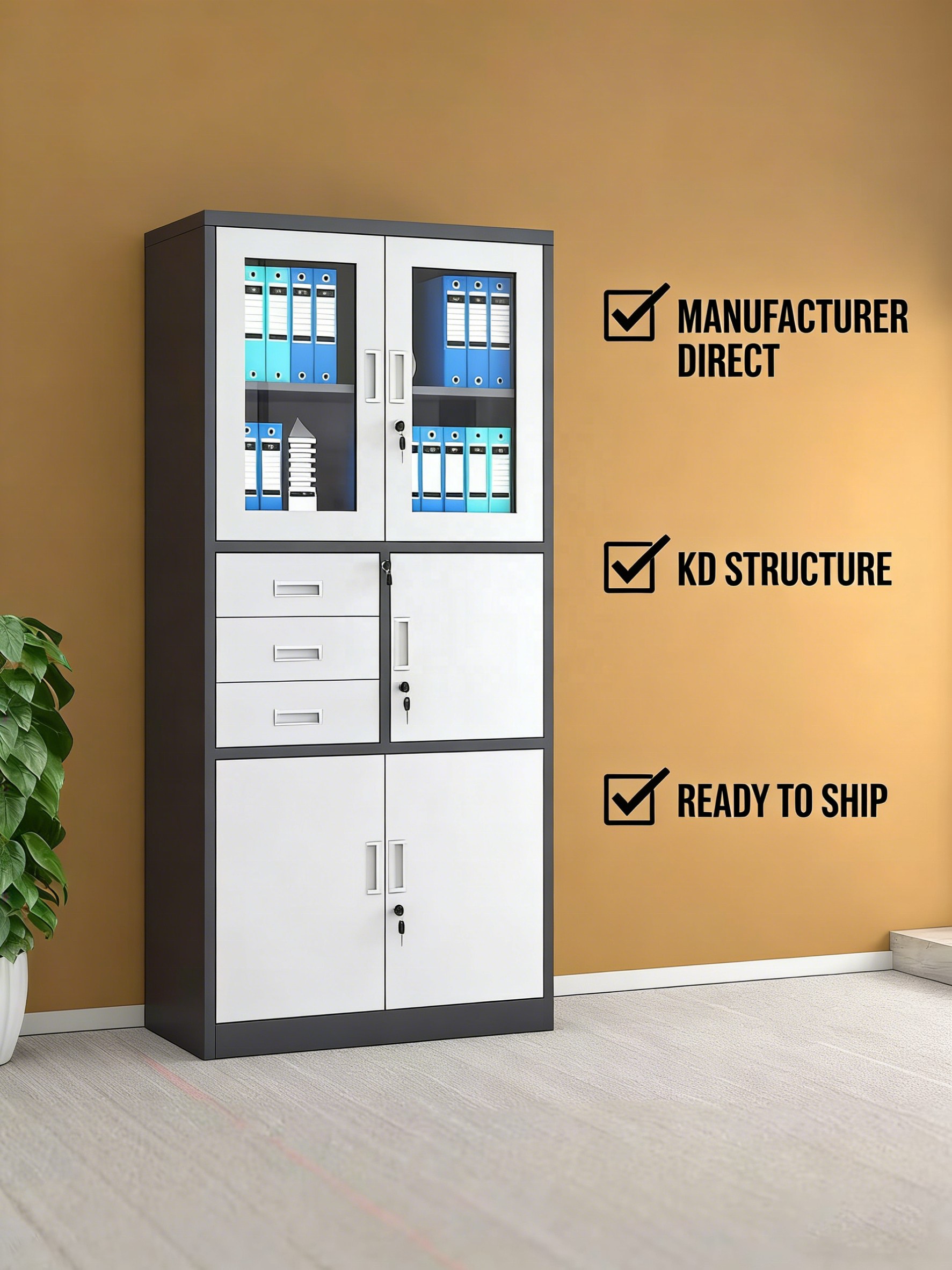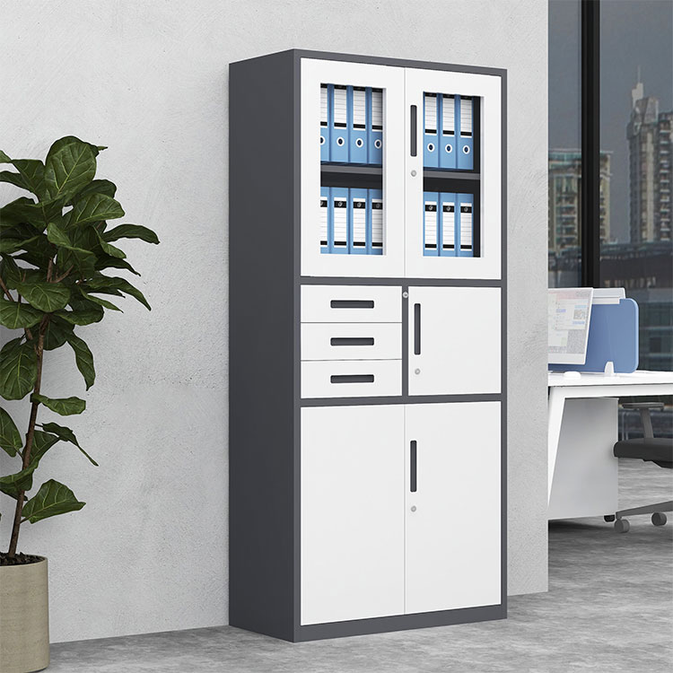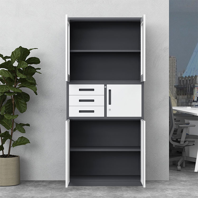 Glass-Front Display Section: The upper twin-door cabinet features high-clarity glass panels, perfect for showcasing reference books, awards, or neatly organized archives while protecting them from dust.